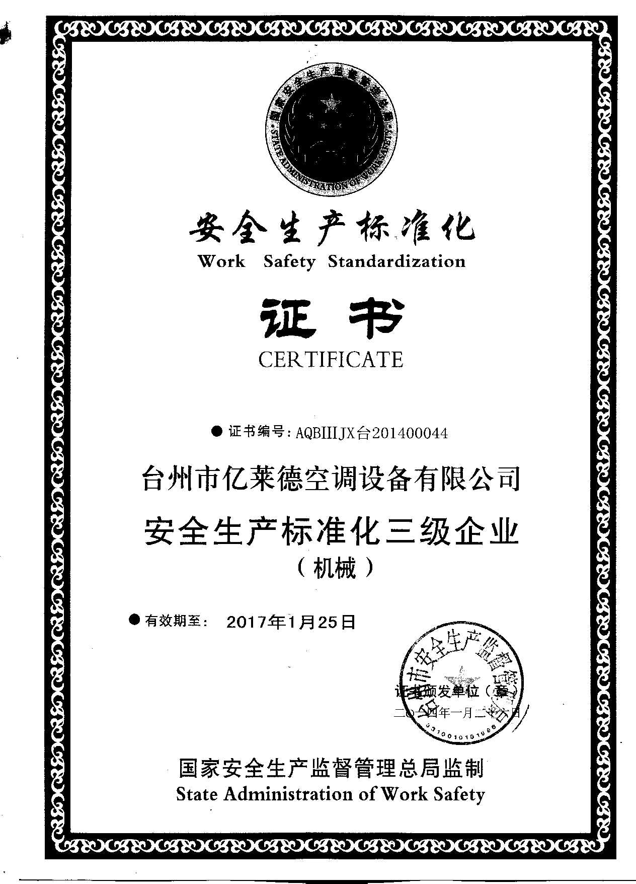 安全生產(chǎn)標準化證書