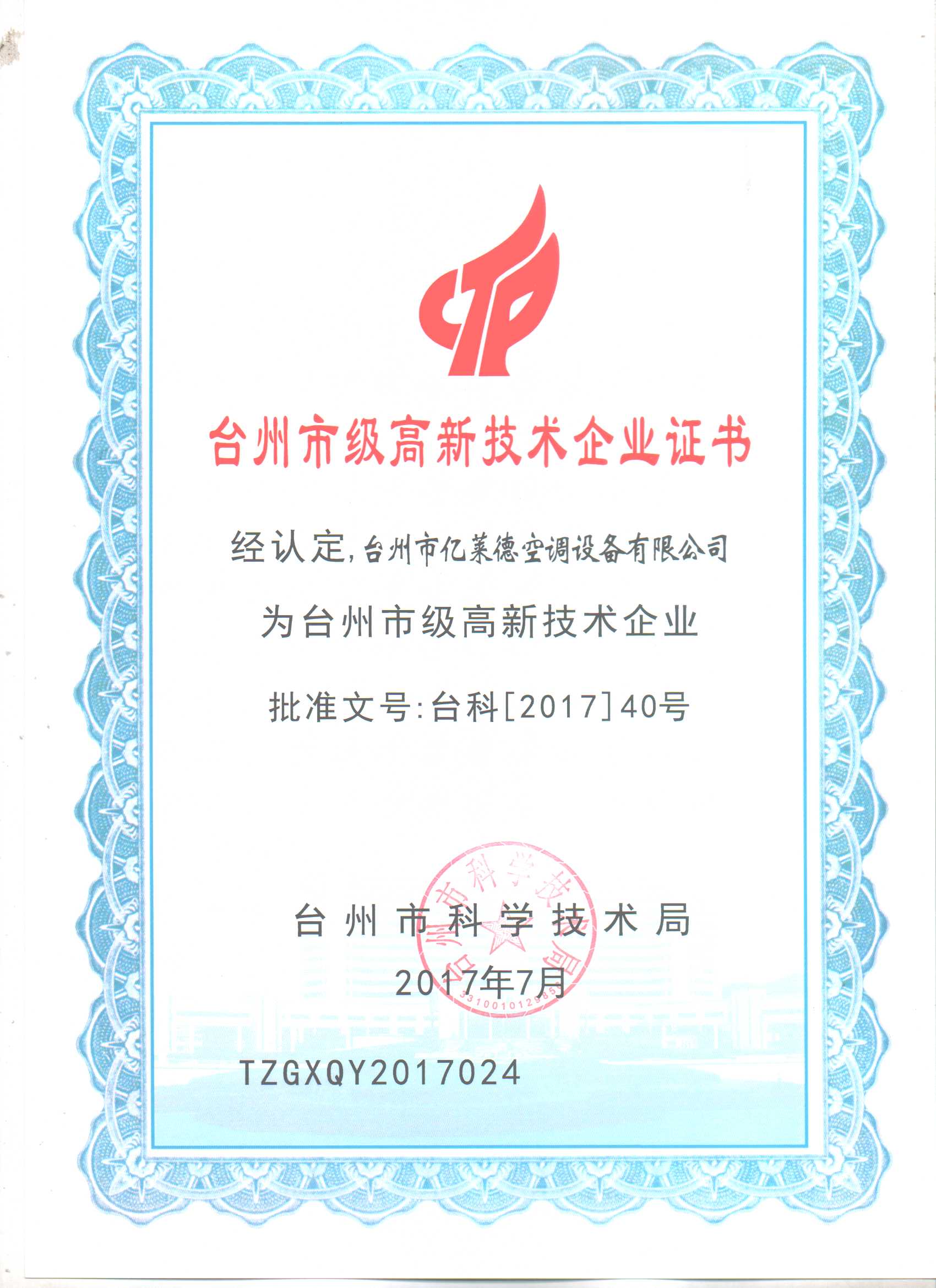 臺州市級高新技術(shù)企業(yè)證書