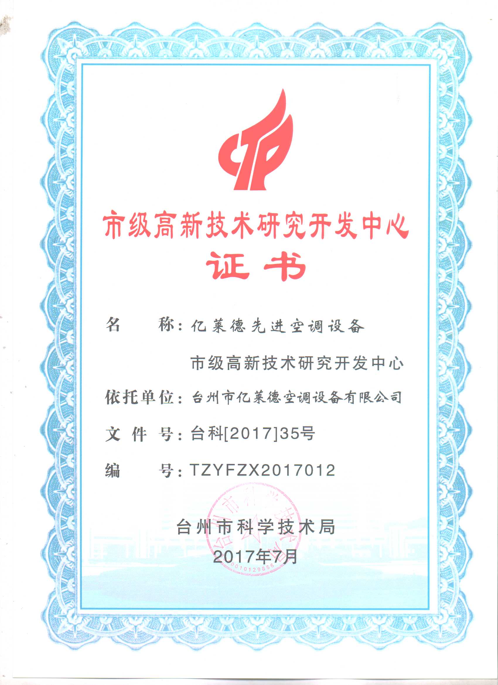 市級高新技術(shù)研究開發(fā)中心證書